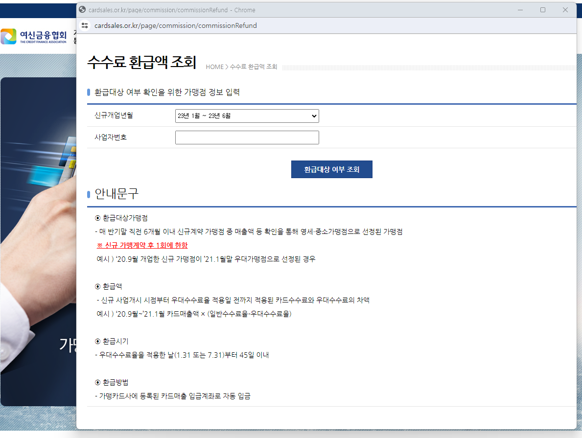 여신금융협회 인터넷 홈페이이지에 접속 후에 사업지 회원가입 이후 홈페이지에서 수수료 환급액 조회하기 하시면 확인이